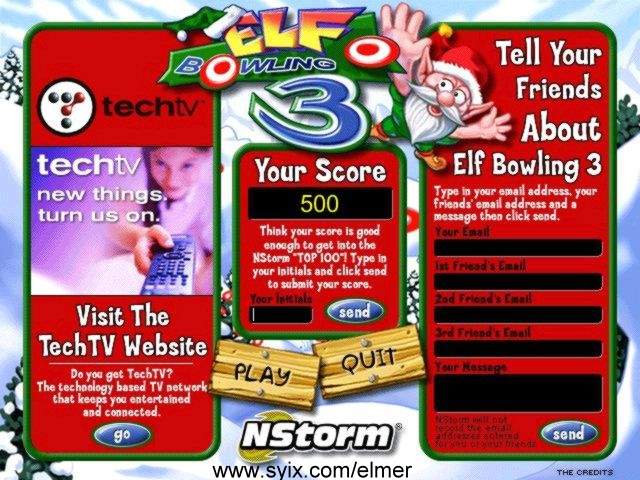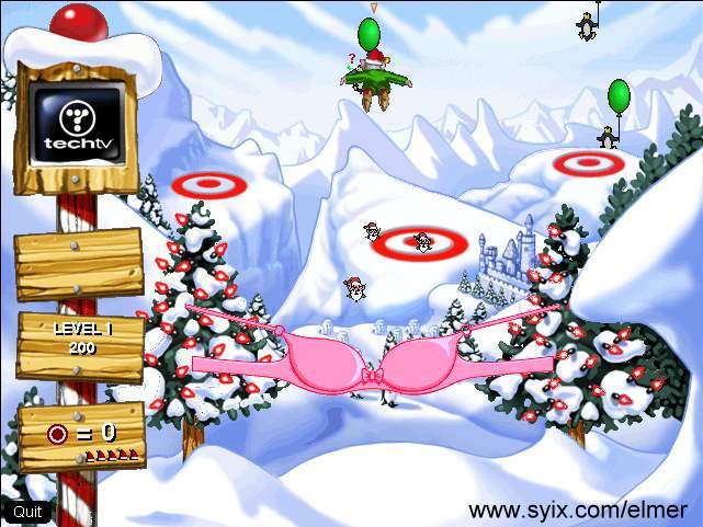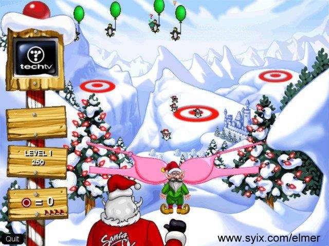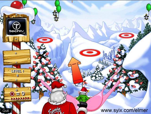 The goal of the game is to slingshot elves into the bulls eye of the three targets. The center target bull's eye is worth 250 points, the target on the left is worth 500 points and the target on the far right is worth 1000 points Miss the target altogether' and you will send the elf falling down the mountain. You can score bonus points by hitting penguins holding balloons floating overhead. There is a bonus round every fourth level for triple points on anything you score in that level. To advance to each new level you must hit at least two bulls- eyes.